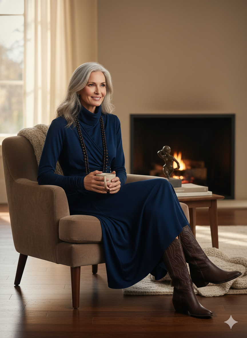 Designed for women who love timeless style and effortless polish, the Marilyne Elegant Maxi Dress brings graceful comfort to every winter occasion. The soft high neckline, long sleeves, and beautifully draped asymmetrical layers create a flattering silhouette that moves with you—never stiff, never clingy.